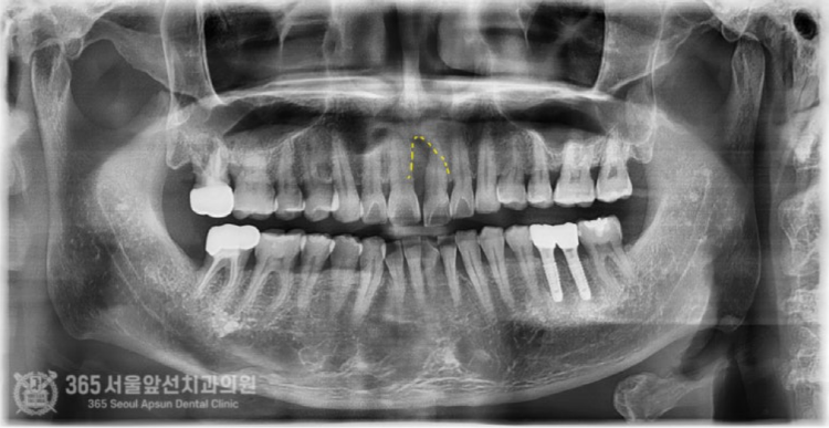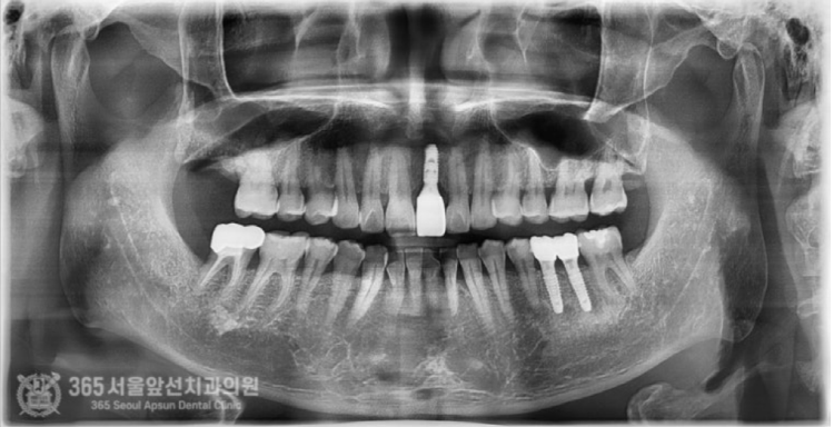 몸에서 냄새가 나고 고름이 나오다가 이제는 저절로 빠질 것 같아요... 안녕하세요. 도화역치과 365서울앞선치과의원입니다. 오늘은 심한 풍치를 앓던 앞니 임플란트 치료증례를 살펴보겠습니다. 이 환자분은 저와 특별한 사연이 있는 환자분이십니다. 바로 제가 일하던 치과의 소독실 전담 선생님의 남편분이신데요. 이렇게 가까이서 소통하던 직원분들도 가족의 치료를 믿고 맡겨주니 기대에 부응하기 위해 책임감을 막중히 느낍니다 ㅎㅎ 촬영일시 : 2024.07.02. 처음 내원당시 엑스레이 사진입니다. 왼쪽 앞니가 많이 안좋아 보입니다. 심한 풍치로 인해 잇몸뼈가 거의 다 없어졌고 치아가 저절로 빠질 정도로 흔들린다고 하셨습니다.