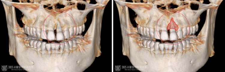 촬영일시 : 2024.07.02. 풍치로 인한 염증 부위를 색상으로 표시해보았습니다. (노란색) 3차원 CT를 이용하여 분석해보니 잇몸뼈가 염증으로 인해 녹은 상태로 매우 심각했습니다.....ㅠㅠ 촬영일시 : 2024.07.02. 결국 해당 치아는 발치를 하게 되었고, 임플란트 식립과 동시에 염증으로 인해 없어진 뼈를 재건하는 골이식을 시행하게 되었습니다. 발치를 하고 나서 임플란트 식립 및 골이식 수술 전 확인해보니 염증으로 소실된 뼈가 상당합니다. 촬영일시 : 2024.07.02. 임플란트를 식립했고 그 위로 두툼하게 골이식을 시행합니다. 일반적으로 골이식은 흡수되는 양이 상당합니다. 그래서 앞니 부위와 같이 미적으로 중요한 부위에서는 자연스러운 잇몸의 볼륨을 위해서 흡수되는 양을 감안하여 많은 양의 골이식을 시행하고있습니다. 임플란트를 식립 후에는 보통 작은 임시틀니를 드리고 그걸 사용하시는 경우가 많은데요. 지금처럼 골이식이 많이 들어간 경우에는 임시틀니를 사용할 경우 이식한 뼈가 제대로 성숙되지 못하는 경우가 많기에 다른 방식의 임시치아를 해드리고 있습니다. 위 환자분께서도 붙이는 형태의 임시치아를 해드렸고 잘사용하셨습니다. 촬영일시 : 2024.11.01. 4개월이 지나서 임플란트가 뼈와 잘 결합되었구요. 이식한 뼈도 단단해졌기에 슬슬 본 뜰 준비를 해봅니다. 동그랗게 회색 단추가 달려있는데요. 치유지대주라고 부르는 구조물로 이걸 이용하여 본을 뜨게 됩니다. 촬영일시 : 2024.11.05. 완성된 최종 보철물입니다. 사실 중간에 임플란트와 연결된 임시치아를 사용하여 잇몸 모양을 잡아주는 과정을 거쳤는데요. 아쉽게도 해당 과정에 대한 사진이 없군요 ㅠㅠ 이렇게 섬세하고 복잡한 과정을 거쳐서 임플란트 치료가 마무리 되었습니다 ㅎㅎ 이식된 뼈 부위도 통통하게 뼈가 잘되어있습니다 ㅎㅎ 만족스럽습니다. 촬영일시 : 2024.11.05. 치료가 마무리 된 후 엑스레이 사진입니다. 최종 보철물 장착 완료까지 자연스럽게 잘 마무리되어 기분이 좋네요. 직원분께서 가족의 치료를 믿고 맡겨주셨고, 그에 보답할 수 있어 기분 좋은 치료 증례였습니다. 앞으로도 더 유익한 치료 증례로 찾아뵙겠습니다. 도화역치과 365서울앞선치과의원이었습니다. 감사합니다. [ 치료기간: 2024년 7월2일 ~ 2024년 11월 5일 ] ※ 365서울앞선치과의원의 모든 포스팅은 각 진료과 의료진이 직접 작성합니다. 365서울앞선치과의원 블로그의 임상 케이스 게시물은 환자분께 의학적으로 정확하고 상세한 정보를 드리기 위해 각 진료과 의료진이 직접 작성하며, 모든 증례 사진은 본원 의료진이 직접 시술한 증례를 촬영한 것으로, 의료법 제23조, 제56조에 의거하며 환자분의 동의를 얻어 포스팅에 사용하였습니다. 또한 해당 케이스는 본 환자분의 치료 결과이며, 환자 상태에 따라 치료의 결과는 달라질 수 있습니다. |
