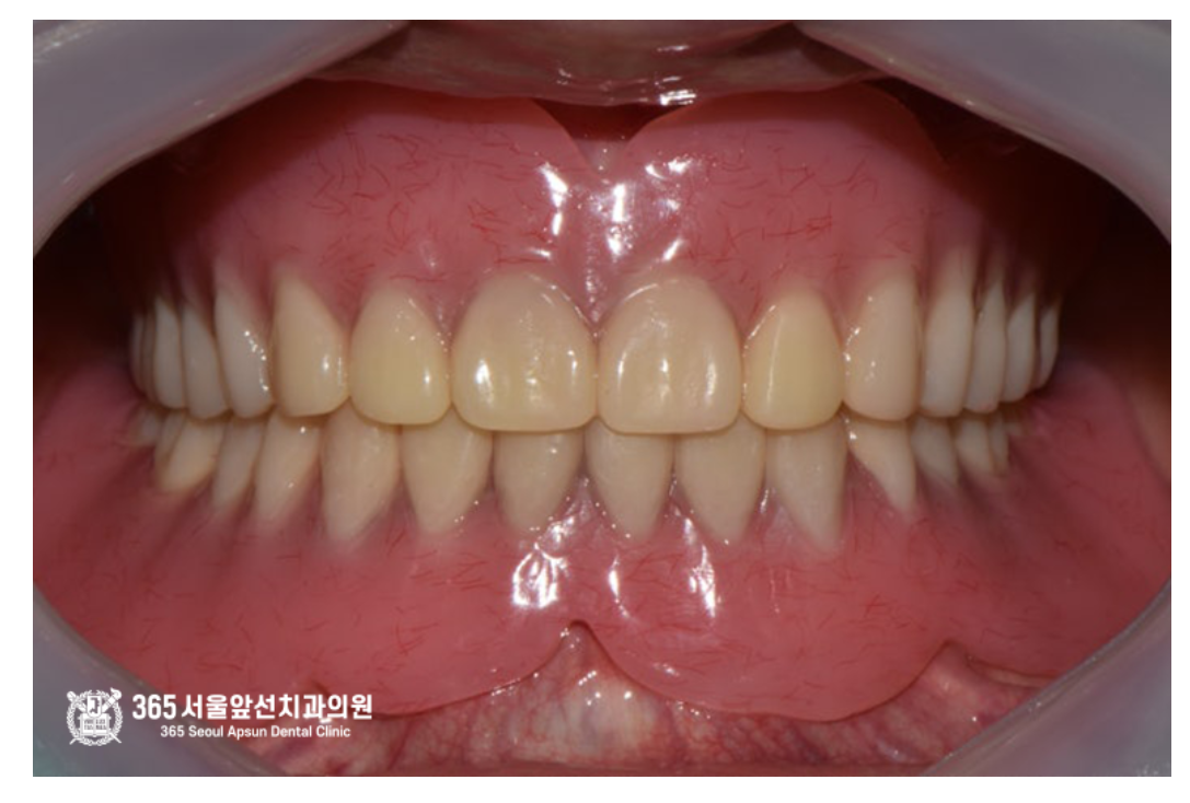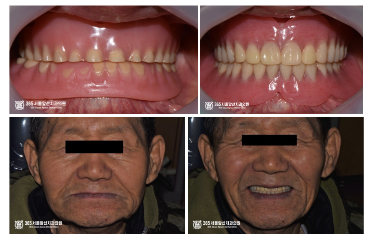 촬영일시 : 2024.08.03 촬영일시 : 2024.09.15 좌측 사진이 기존틀니를 착용하셨을때 얼굴모습이고, 우측 사진이 새로 제작한 틀니를 착용하셨을때 모습입니다. 틀니 하나만으로도 인상이 확 바뀜을 아실 수 있습니다. ㅎㅎ 오늘은 전체 틀니를 제작해드렸었던 증례를 소개해드렸습니다 ㅎㅎ 최근에는 전체 임플란트라는 매우 좋은 치료법이 있으나, 여러가지 이유(전신질환, 비용 등)로 인해 틀니 치료를 할 수 밖에 없는 경우도 분명히 존재합니다. 저희 365서울앞선치과에서는 틀니 치료가 필요한 환자분들을 위해 매순간 최선을 다하고 있습니다ㅎㅎ 앞으로도 유익한 치료 증례로 찾아뵙겠습니다 !