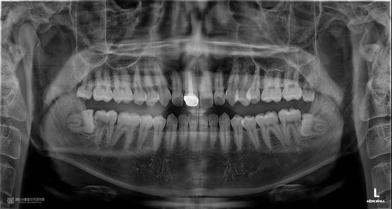 촬영일시 : 2024.09.13 주안동치과추천 365서울앞선치과의원 초진 내원 당시 파노라마 엑스레이 사진인데요. 사진상 오른쪽 중절치에 신경치료가 되어 있고 크라운이 씌워져있는 것이 관찰됩니다.