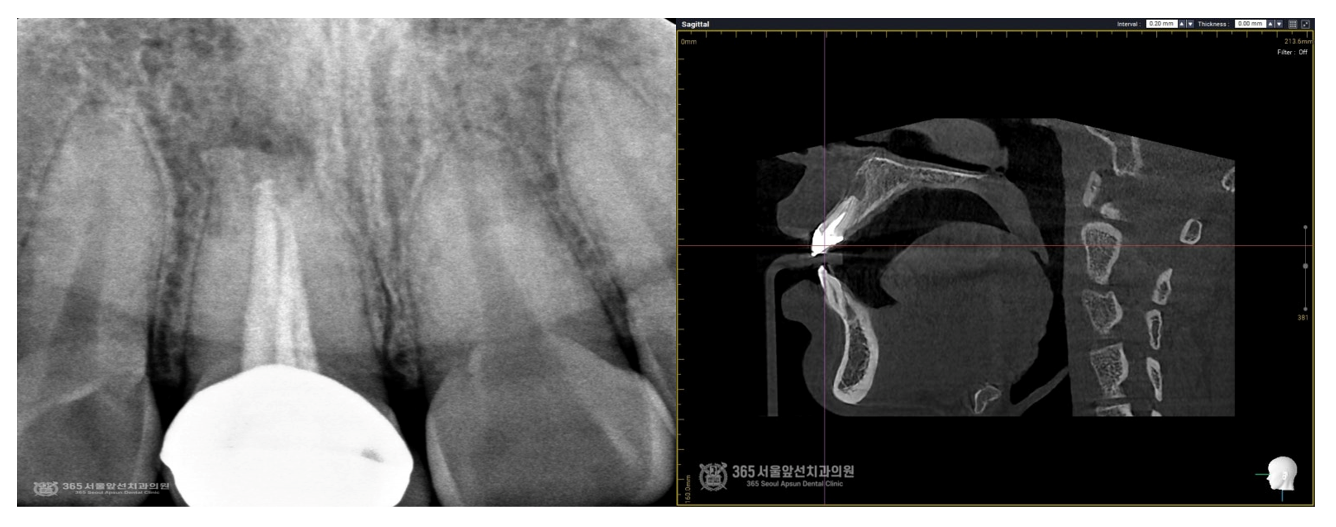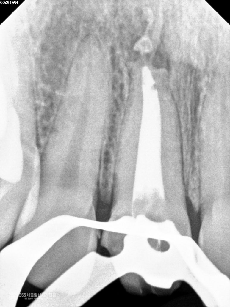 안녕하세요~ 365서울앞선치과입니다. 오른쪽 대문니에 커다란 고름주머니가 생긴 환자분께서 주안동치과추천 365서울앞선치과에 내원하셨어요. 해당 치아는 과거에 외상으로 신경치료 후 크라운을 씌워서 사용하고 계셨던 치아였는데요. 검사 소견상 재신경치료로 살려 볼 여지가 있어서 재신경치료를 주안동치과추천 365서울앞선치과에서 시행했고, 그 결과가 양호하여 증례를 소개하고자 합니다 ㅎㅎ