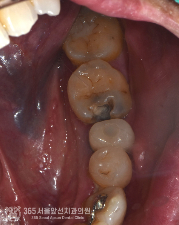 촬영일시 : 2024.06.01 초진 내원당시 사진입니다. 큰 어금니의 앞쪽에 까맣게 충치(치아우식증)가 진행되어 구멍이 크게 뚫린것이 관찰됩니다.
