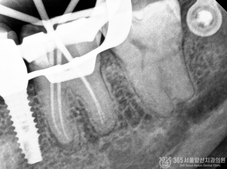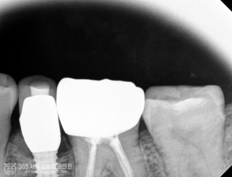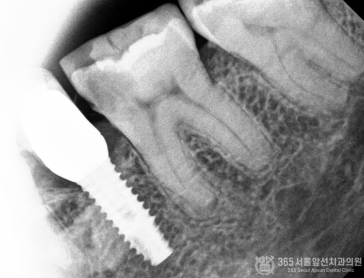 촬영일시 : 2024.06.01 엑스레이 사진에서도 임플란트 옆 치아에 심한 치아우식증이 관찰됩니다. 치아우식증이 신경까지 진행되었기 때문에 이 경우에는 신경치료가 필요하겠습니다.