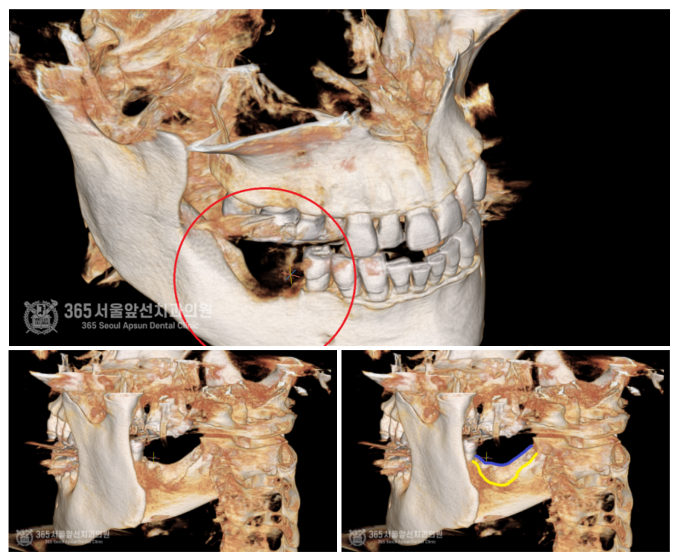 촬영일자:24.05.09 발치가 끝난 후 촬영한 3차원 CT 입니다. 매우 심각하게 매복되어있던 치아들을 발치했던 공간이 크게 함몰되어 있는 것이 관찰됩니다. 추후 임플란트 치료를 위해서 상당량의 뼈이식이 필요함을 알 수 있습니다. 파란색 선: 함몰 부위의 볼쪽 가장자리 선 노란색 선: 함몰 부위의 혀쪽 가장자리 선 뼈손실 부위가 아주 깊게 파여있는 것을 다른 각도에서도 볼 수 있습니다.
