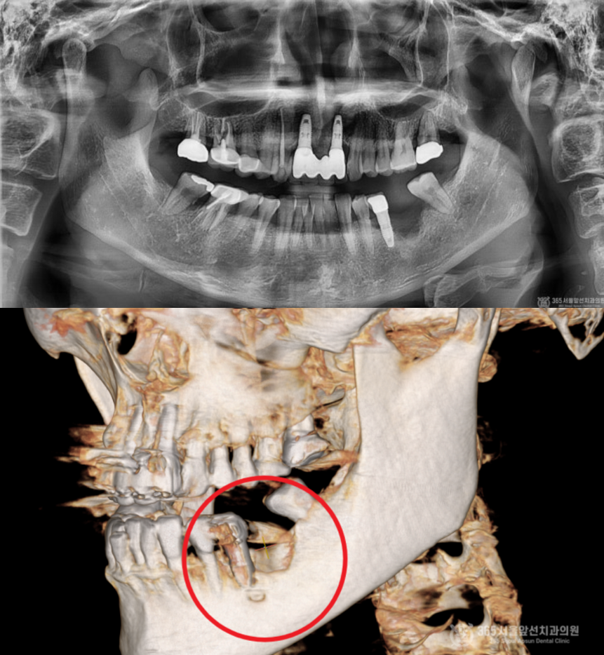 촬영일시 : 2024.05.19 X-ray 사진(위 이미지)상 오른쪽 아래(실제 입안에서는 왼쪽 아래 부위) 어금니 부위에 염증이 심하게 온 임플란트와 해당 임플란트 옆에 심한 치주염으로 발치가 된 자리가 보입니다. 또한 수술 전 CT 사진(아래 이미지) 을 찍어보니 마치 폭탄을 맞은듯하게 뼈가 웅덩이처럼 파여있는 모습이 관찰됩니다. 게다가 제거해야할 임플란트 아래쪽으로 신경이 지나가는 구멍이 있어서 수술을 할때 매우 주의해야하는 상황이었습니다. 두 자료를 를 종합해서 볼 때 뼈가 아래쪽으로 움푹 파여있어서 주변부위와 뼈의 높이를 맞춰주면서 염증에 이환된 임플란트를 제거하고 새로 식립하는 수술을 계획하였습니다.