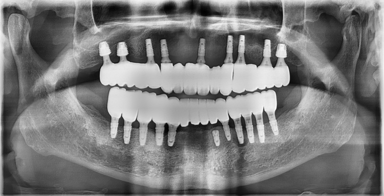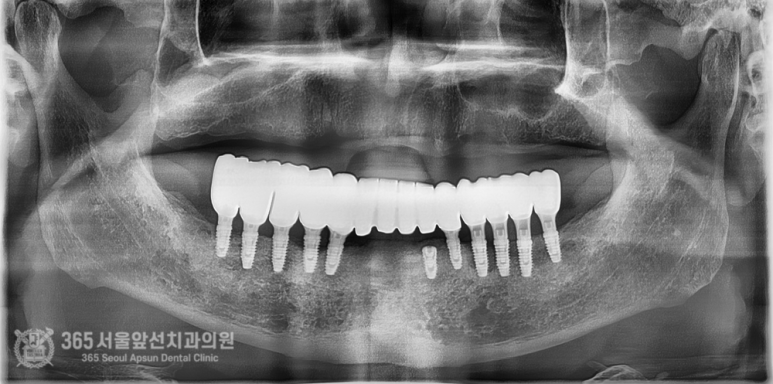 촬영일시 2024.09.01. 내원 당시 술전 파노라마 엑스레이 사진입니다. 환자분 안모 기준으로 좌측 작은 어금니 부위(#24,25번 치아 부위)를 제외한다면 뼈의 상태를 수술하기에 양호한 편에 속합니다. (저희는 이런 경우를 운동장 같은 뼈라고 비유하곤합니다 ㅎㅎ) 촬영일시 2024.11.01. 좌우측 어금니 부위에는 상악동거상술(수직접근법)을 동반하여 임플란트를 심어드렸구요. 앞니 부위는 뼈이식을 통해 뼈의 두께를 늘려드렸습니다. 처음 말씀드렸던 환자분 기준 왼쪽 작은 어금니 부위(#24,25 치아 부위)에도 뼈이식을 충분히 하여 골재생을 도모했습니다. 가이드나 스탠트의 도움이 전혀 없이 상악동 거상술 및 골이식을 포함하여 임플란트 9개를 식립하는데 대략 40분이 좀 안걸렸습니다. 임플란트간 위치와 기울기가 보기 좋게 식립되었습니다 ㅎㅎ (매일매일 하다보면 수술이란게 환자분들 걱정만큼 오래 걸리지 않습니다 ㅎㅎ) 임플란트가 좋은 위치에 식립되고 잘 완성된 모습입니다. 촬영일시 2024.12.10. 환자분께선 걱정을 많이 하셨는데 순식간에 끝났다며 좋아하셨습니다 ㅎㅎ 상악동 거상술 부위와 골이식 부위가 단단하게 굳는 기간 동안 무리하지 않도록 주의를 당부드렸습니다.