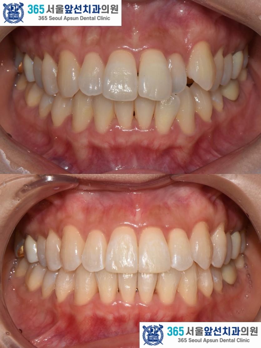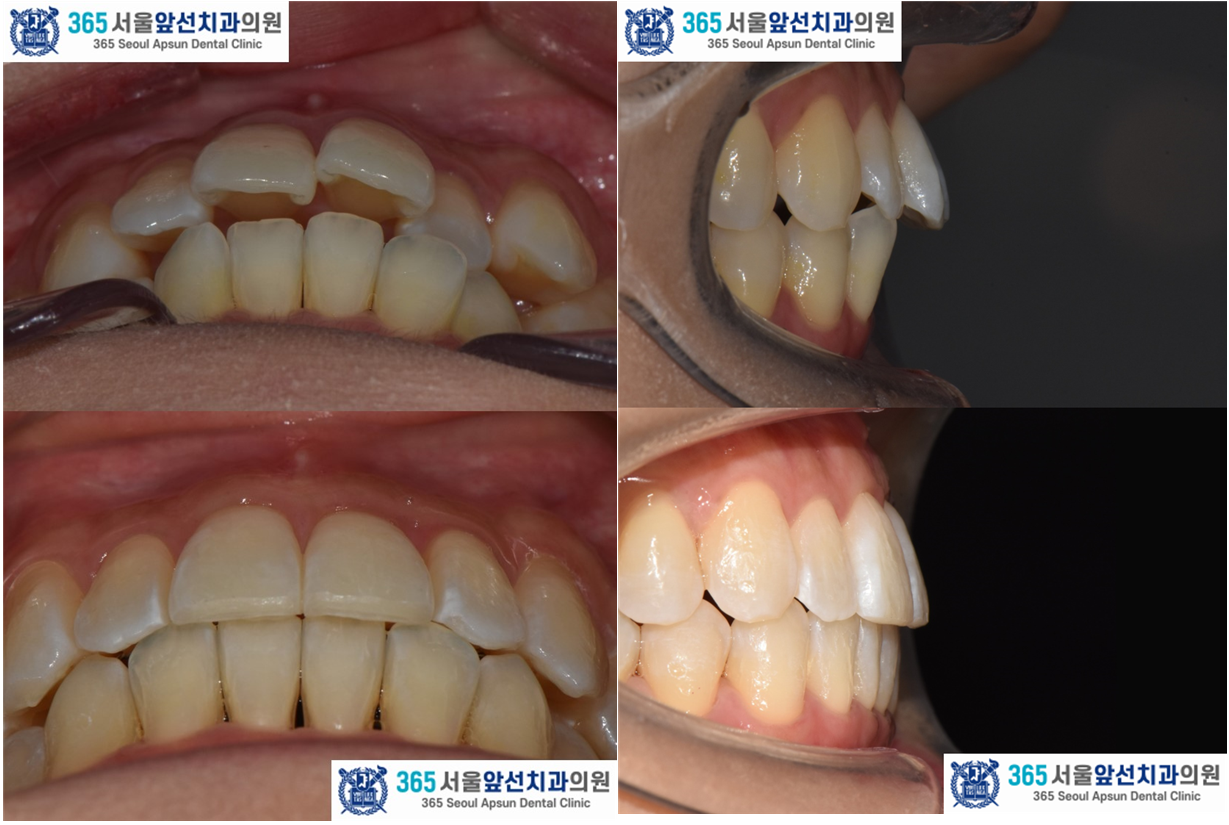 촬영일시 : 2024.11.26. / 2025.12.18. 앞니의 돌출과 반대로 물리는 앞니, 송곳니 덧니를 고민으로 내원하신 30대 여성 환자 분의 증례를 소개드리겠습니다. 치료 전, 윗니와 아랫니 사이의 거리(수평 피개)가 5.00mm, 상,하악 치열 각각 2.48mm, 2.69mm 의 필요 공간이 있는 경미한 총생(Crowding), #22 치아의 반대교합과 #23 치아의 협측 이소맹출이 관찰됩니다.